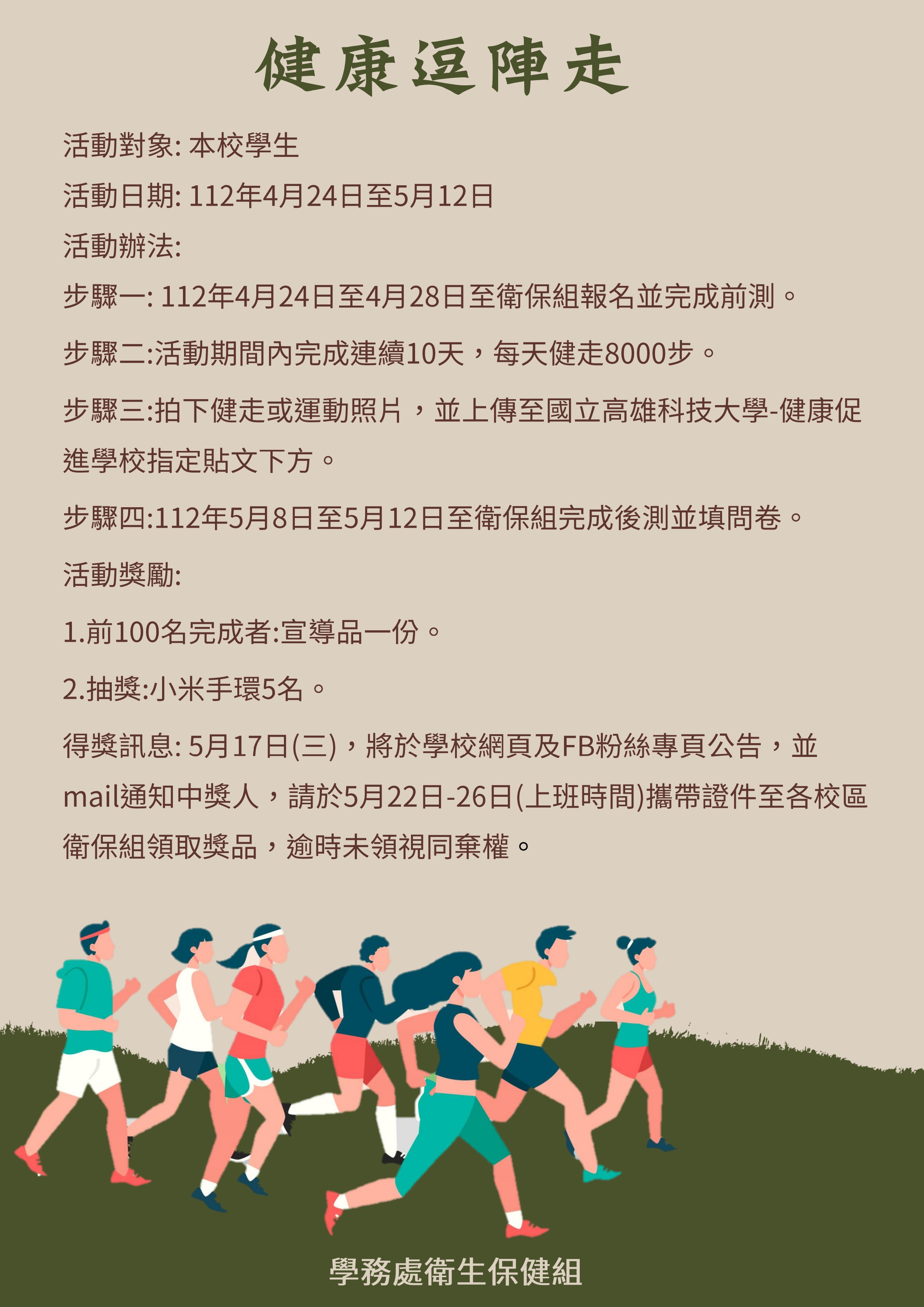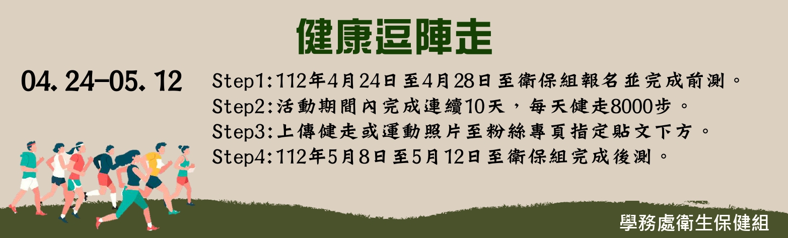 【活動通知】112年05月08日至05月12日「健康逗陣走」健走活動後測,敬請踴躍參與。