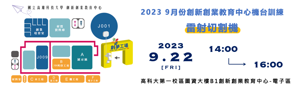 請對於雷射切割機有興趣的同學們填寫報名表單一同參與創夢工坊的雷射切割機教育訓練,課程時間:9月22日星期五下午2點~下午4點,上課地點:高科大第一校區圖資大樓B1創新創業教育中心-電子區,一梯次人數上限18人,本表單只限回答一次不可修改,表單如有任何問題請洽:C110118211@nkust.edu.tw。