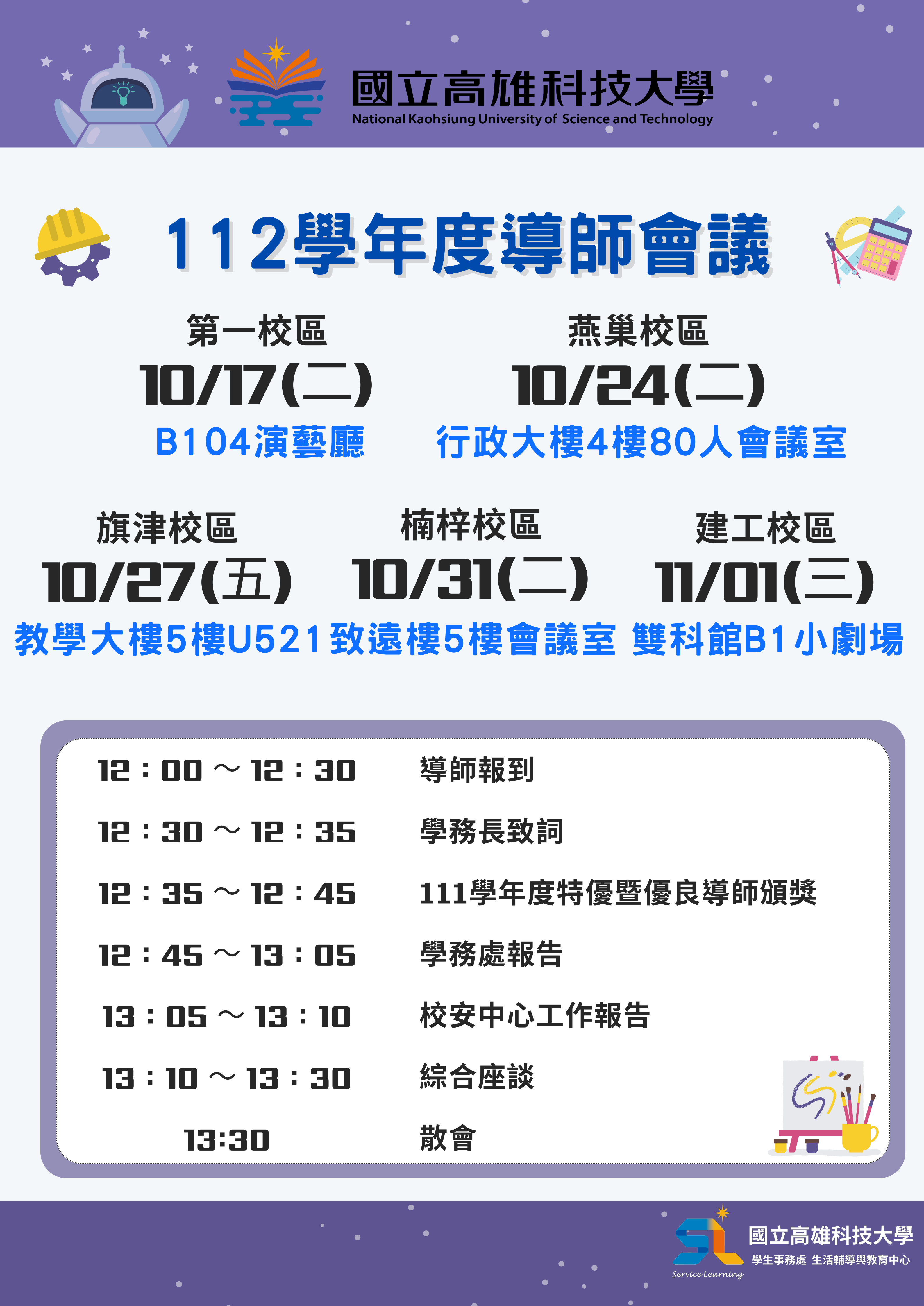 本學期分別於五校區辦理實體會議,本場次為旗津校區,請老師自由選擇1場參加即可