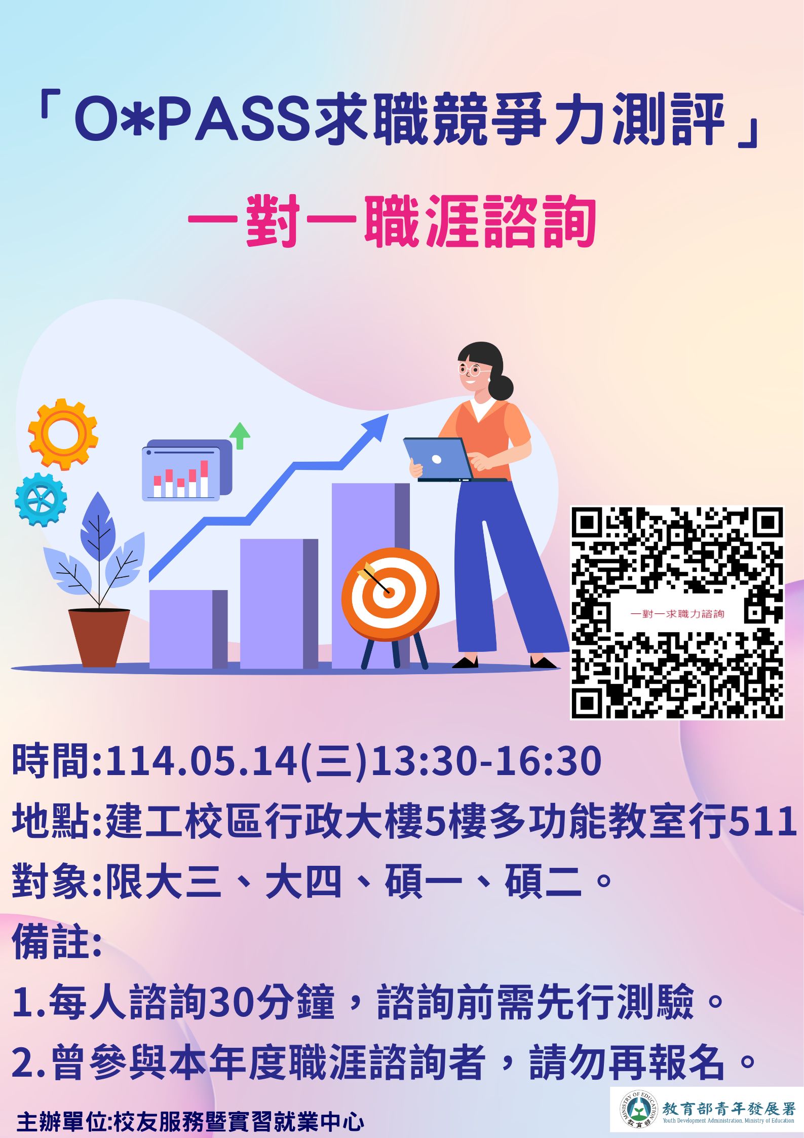 (暫停辦理)「O*PASS求職競爭力測評」一對一職涯諮詢(限大三、大四、碩一、碩二、應屆畢業生)