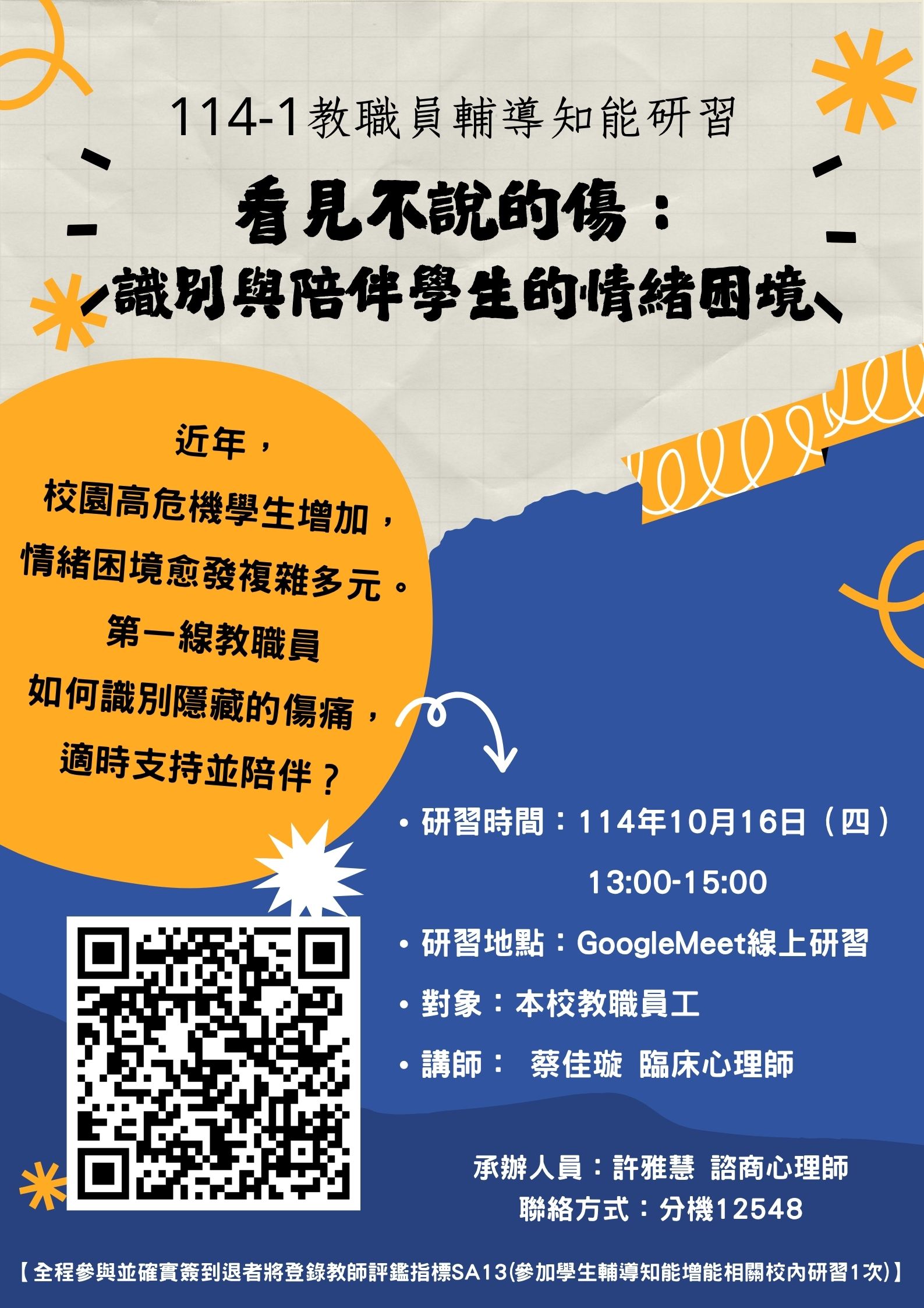 【建工校區】114-1教職員輔導知能研習 《看見不說的傷:識別與陪伴學生的情緒困境》