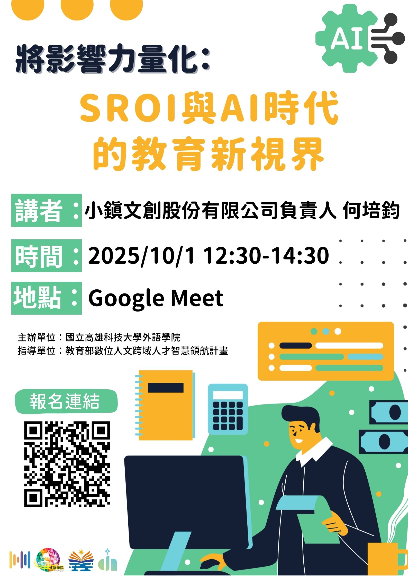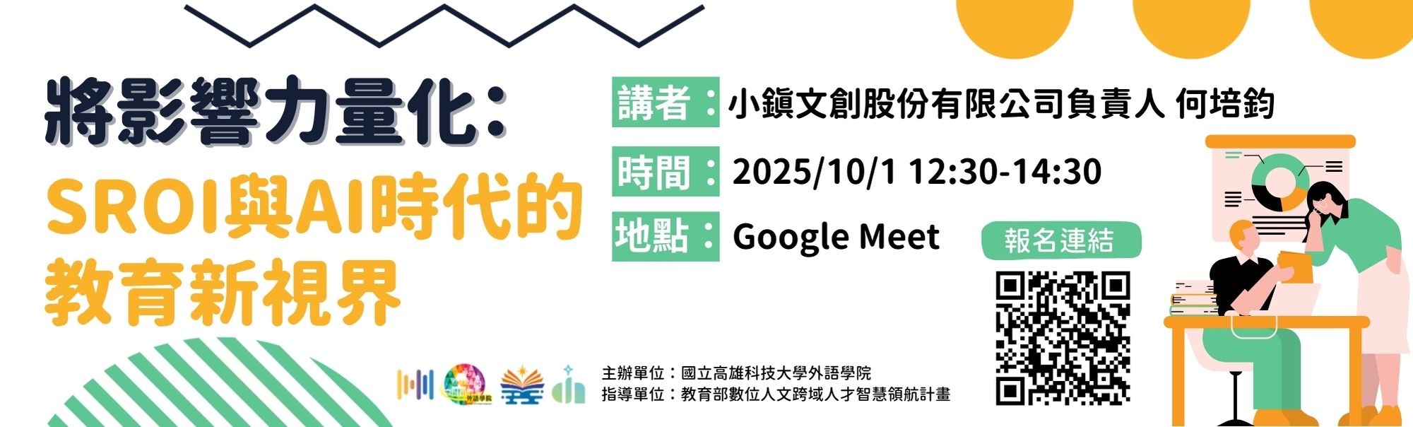 在學習與教學的過程中,很多收穫往往無法立刻表達。本場演講將介紹 ✨社會投資報酬率(SROI)✨ 的理念,並展示如何將它應用於 AI、語言、跨文化永續探索與數位人文教育。藉由SROI,我們能將「看不見的價值」轉換為「可以被理解與傳達的數據與故事」,讓教育的影響力更有說服力與能見度。