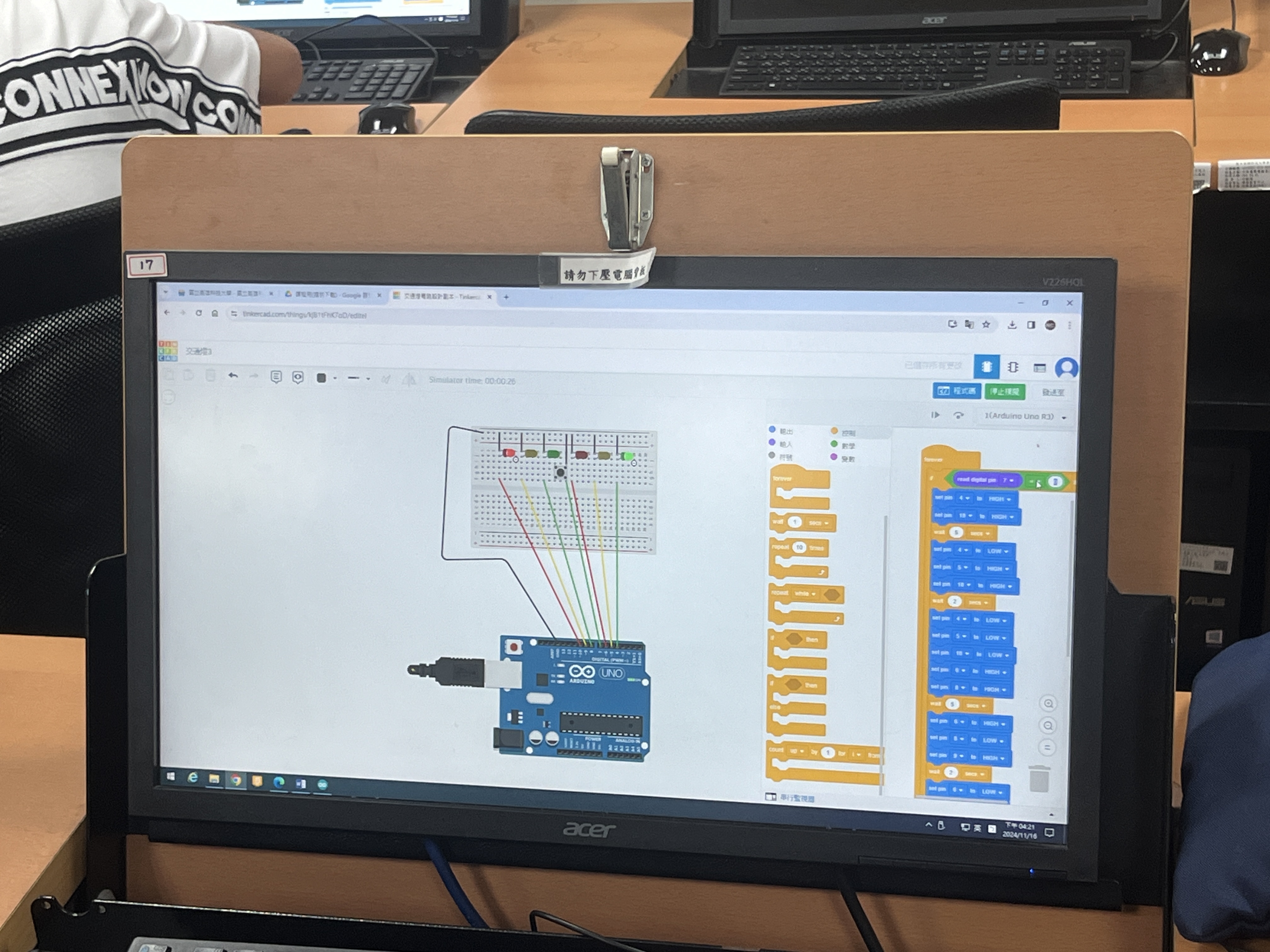 (3)程式撰寫與接線、認識電子元件、LED 燈閃爍、按鈕控制。