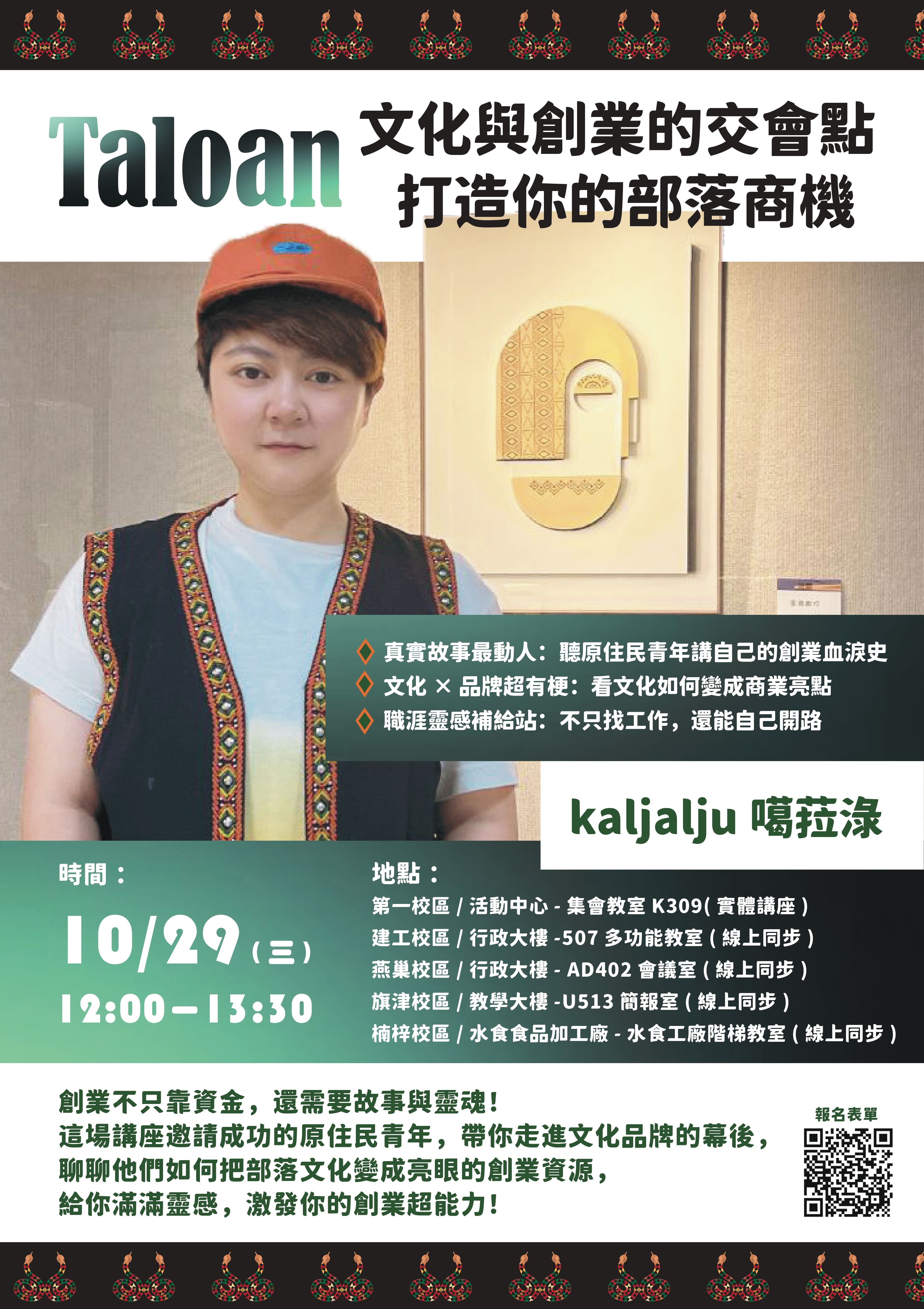 想知道文化如何變成創業能量嗎?本講座邀請成功的原住民青年創業者,分享從部落文化到品牌打造的實際經驗。透過真實案例,你將看見文化如何成為創新的源泉,也能啟發自己從生活與文化背景中找到職涯發展的新可能。這是一場文化與創業交會的對話,帶你思考如何創造屬於自己的文化價值與商機!