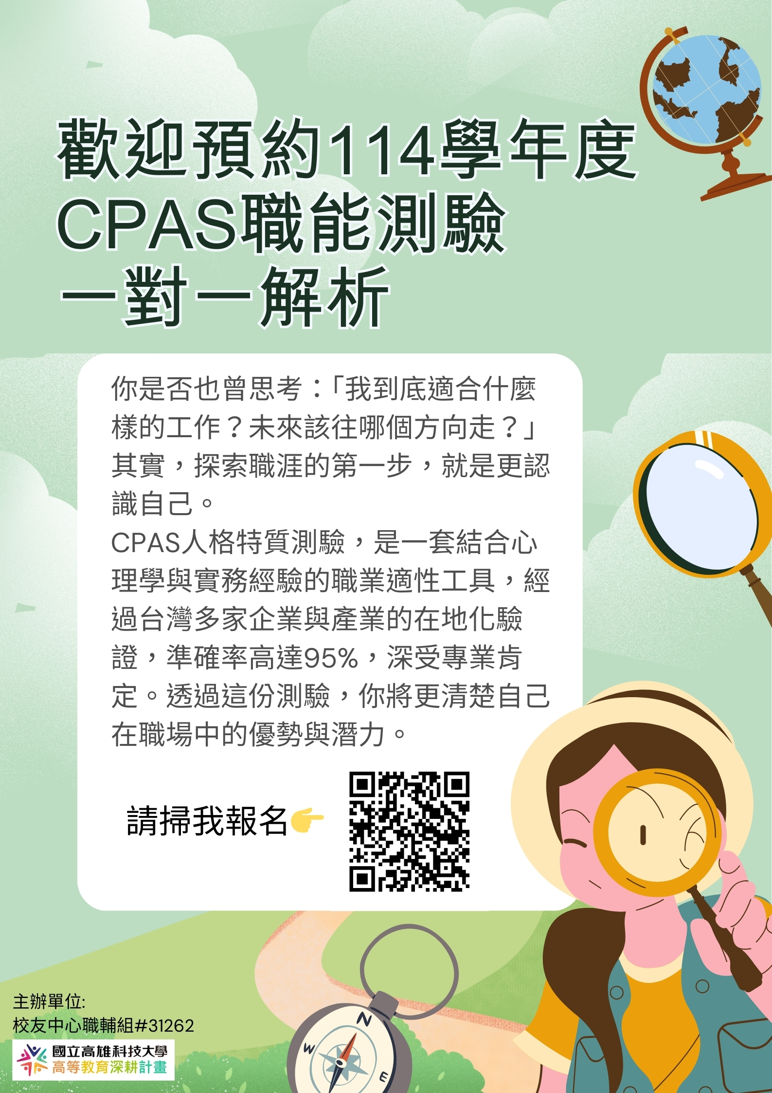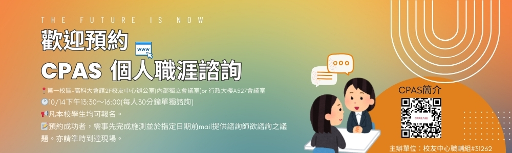 由校友服務暨實習就業中心主辦,受CPAS訓練核可之諮詢師替你解讀CPAS測評結果,讓你不再對職涯方向感到迷惘。想轉換跑道、找實習、規劃未來?這一站先幫你釐清方向!