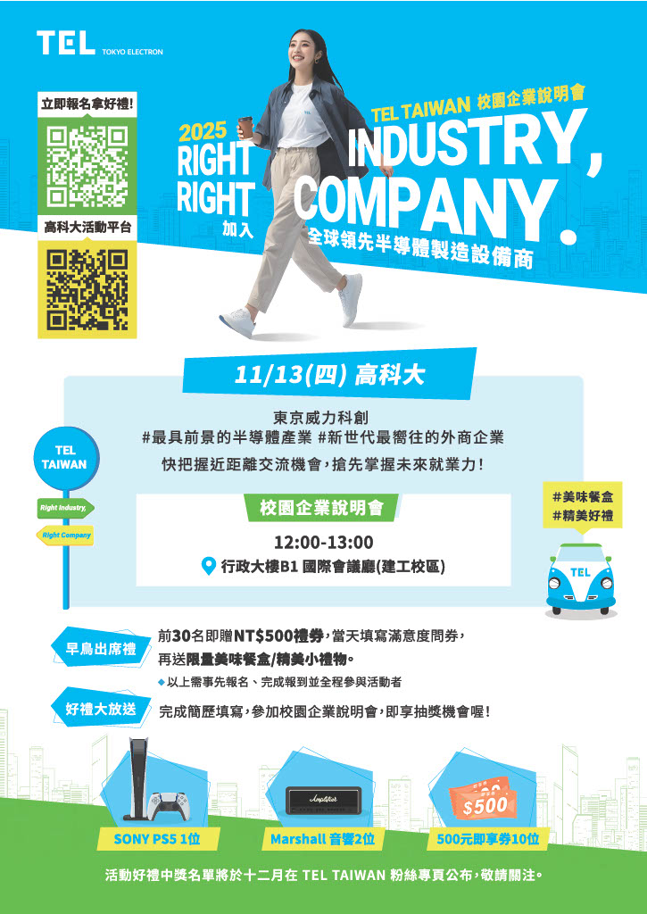 為讓學生更進一步認識TEL,並邀請畢業學長姐回母校分享,內容將涵蓋個人經歷、業界經驗以及在TEL的實際工作經驗等,期望透過學長姐的親身經歷,幫助學生對未來職涯有更清晰的規劃與準備。本次活動純屬交流與分享性質,適合對象以電資學院、工學院相關科系優先,歡迎對相關領域有興趣之同學踴躍參加,面對面了解東京威力,搶先展開的外商職涯第一步!