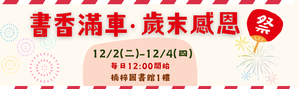 感謝大家一年來對楠梓圖書館的支持,在這歲末之際,我們推出精選「書車」與豐富「花車」,邀請大家一起來讀好書,拿好禮,來場熱鬧的書香慶典吧!