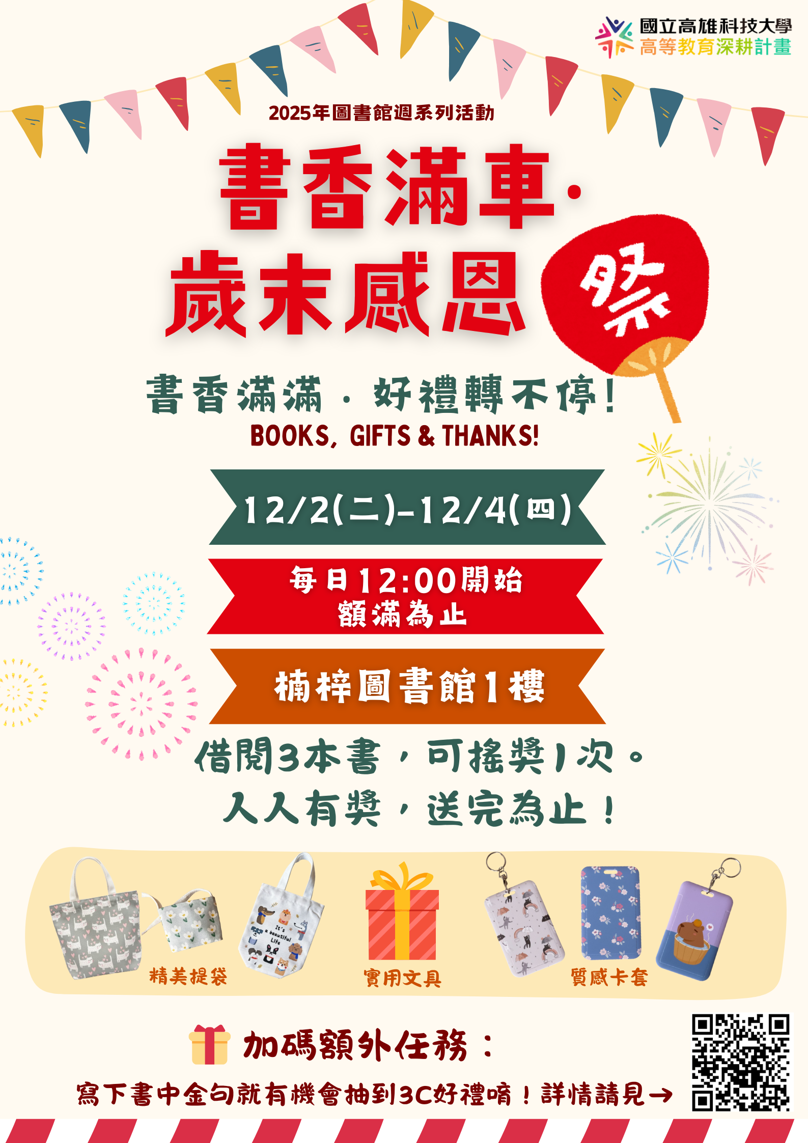 楠梓圖書館準備了一場充滿驚喜的「書香慶典」,讓你邊借書、邊玩遊戲、邊拿好禮,一起開心收尾這一年!