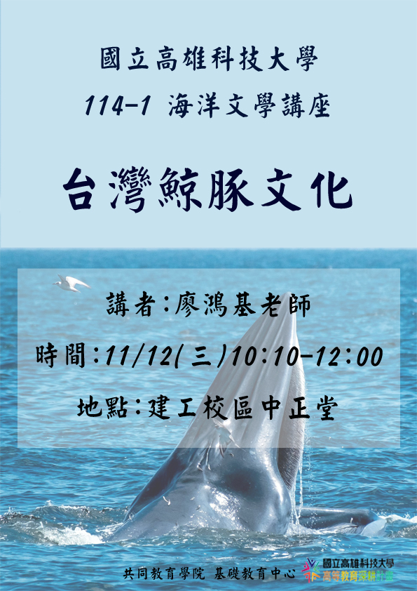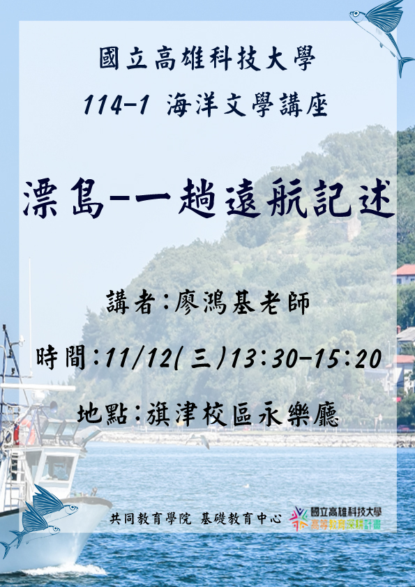 台灣文學作家廖鴻基曾從事漁撈,執行鯨豚海上生態調查規劃及推行賞鯨活動11/10、11/12、11/13、11/19接續四天將蒞臨高科大帶領大家共同參與海洋文學盛宴,以海上觀察員的視角分享「台灣魚漁文化」、「台灣鯨豚文化」、「漂島-一趟遠航記述」、「師從大海」以及「黑潮漂流」等海上奇遇主題與相關歷程。