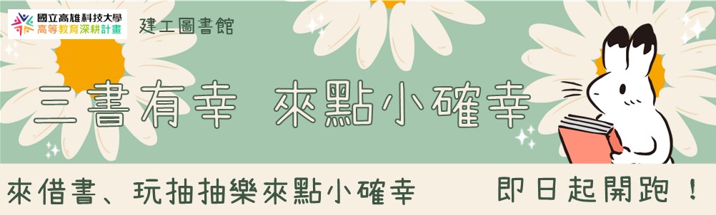 - 活動期間利用24小時服務智慧圖書站(育賢樓1樓)、自助借書機(建工圖書館2樓)或智慧預約取書區(建工圖書館1樓)借閱3本圖書,可憑當日E-mail收據至櫃台玩抽抽樂抽獎乙次。
