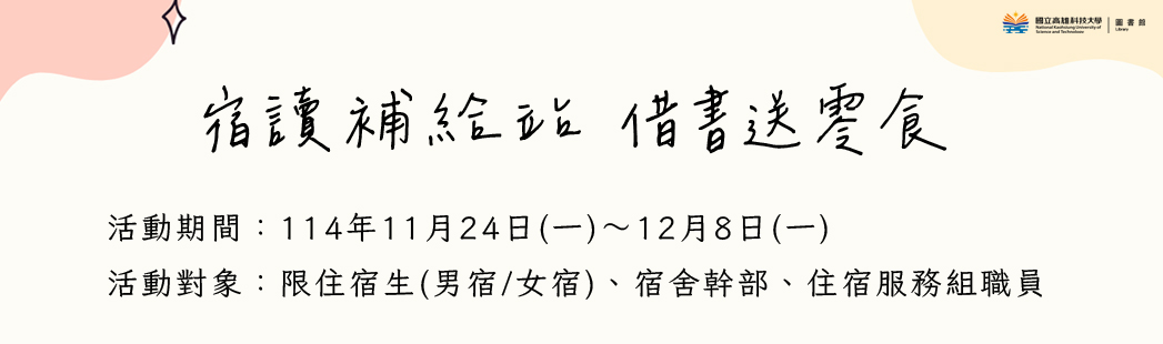 1.於24小時服務智慧圖書站借閱圖書2冊,至女宿住宿服務中心出示當日email收據,兌換零食乙份。