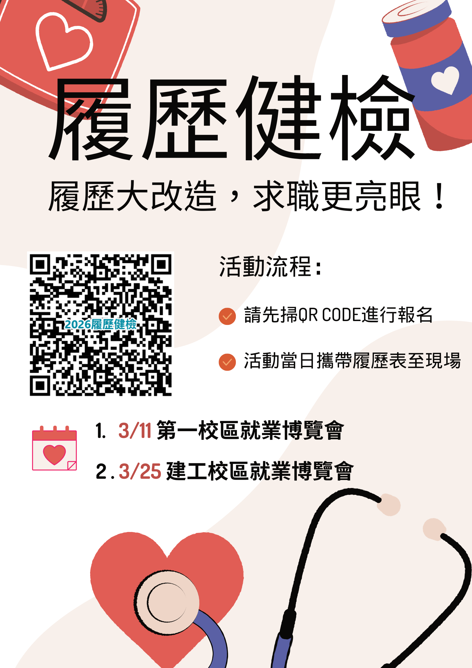 高雄科技大學校園就業博覽會將於3/11第一校區及3/25建工校區舉行,活動當日將提供履歷健檢活動,每位同學15分鐘,名額有限