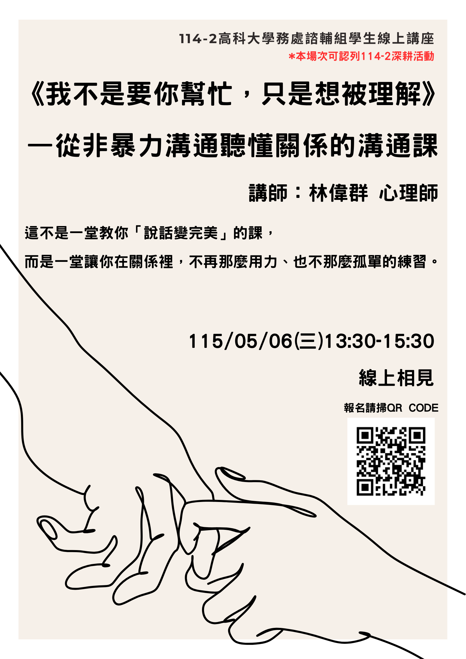 05/06(三) 《我不是要你幫忙,只是想被理解》—從非暴力溝通聽懂關係的溝通課 學生講座(認列深耕)
