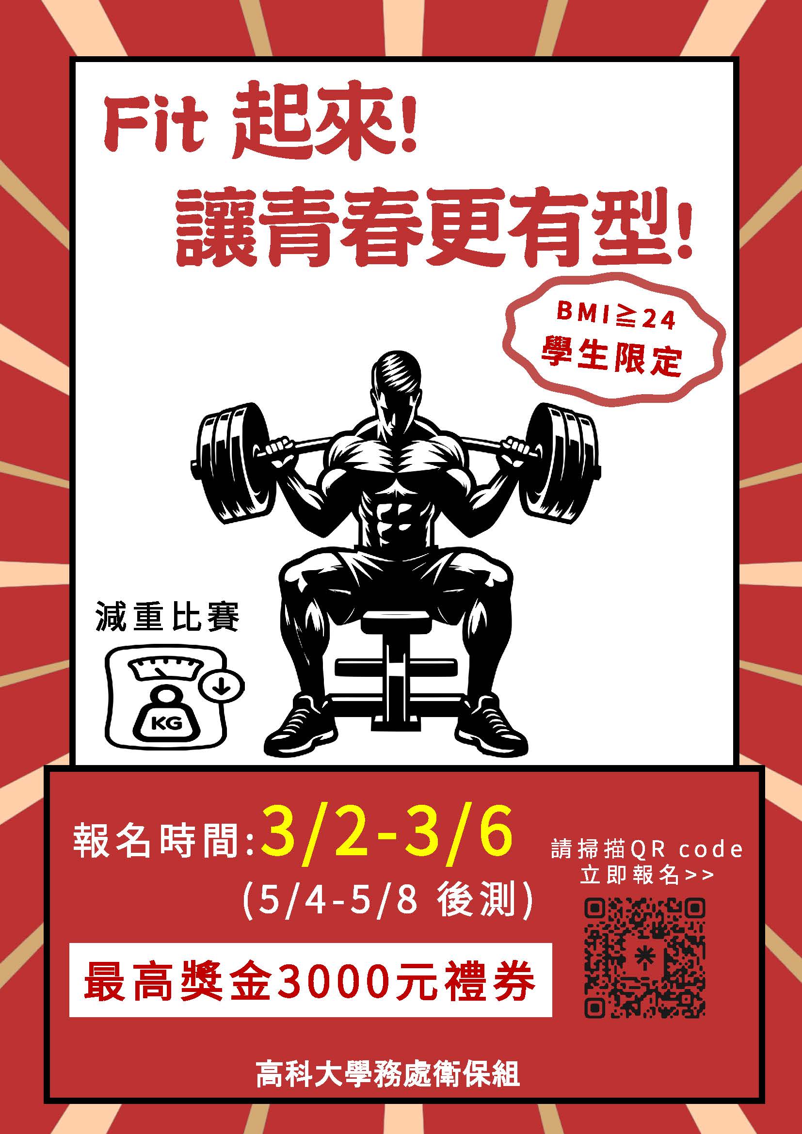 【減重班】衛保組3/2-3/6辦理「Fit起來 讓青春更有型!」(前測)活動,歡迎符合BMI≧24的學生踴躍報名參加