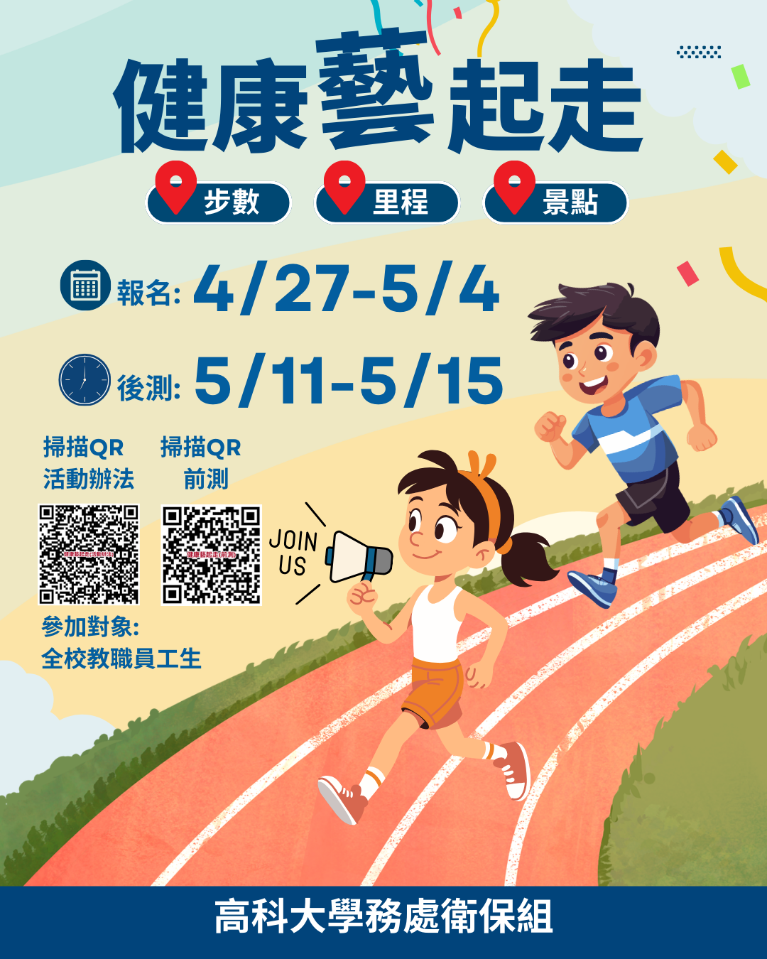 【健走活動】衛保組4/27-5/4辦理「健康藝起走」(前測)活動,歡迎全校教職員生踴躍報名參加