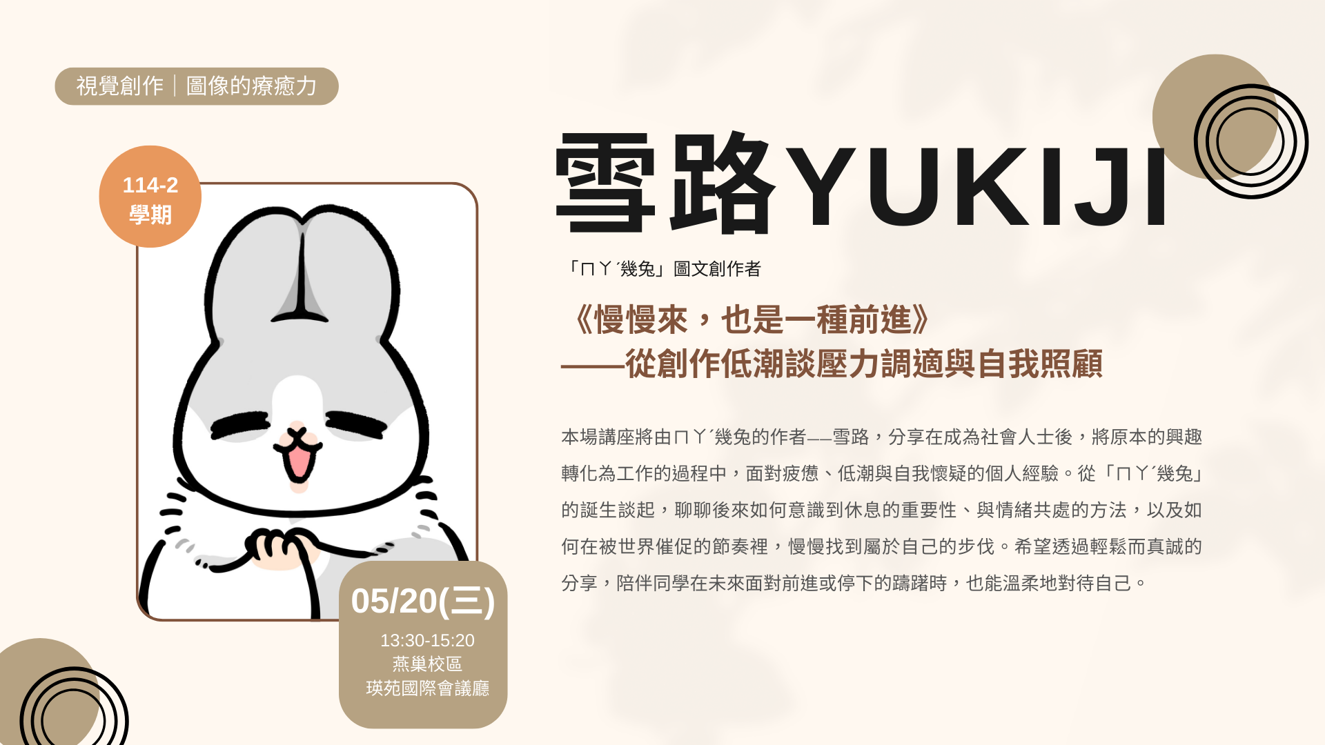 114-2 ✨通識微學分場次認證報名專用✨【高科人文講堂X大師開講】雪路YUKIJI - 《慢慢來,也是一種前進》 ——從創作低潮談壓力調適與自我照顧