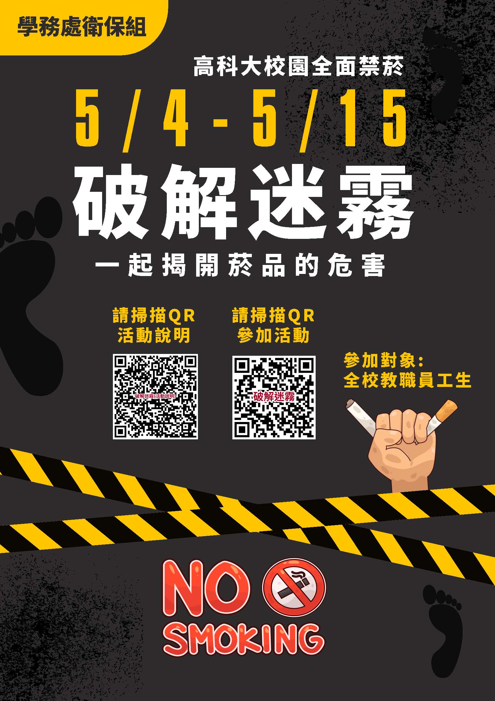 【菸害解謎】衛保組5/4-5/15辦理「破解迷霧」活動,歡迎全校教職員生踴躍參與。