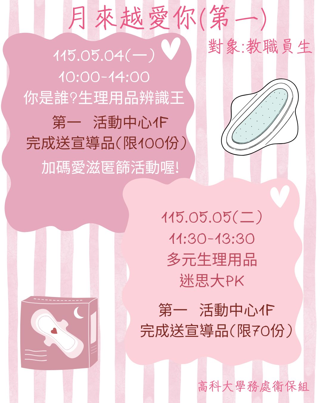 第一校區-5/4-5 月來越愛你 系列活動,歡迎來攤位互動,認識多元生理用品新面貌!還有小禮物喔~